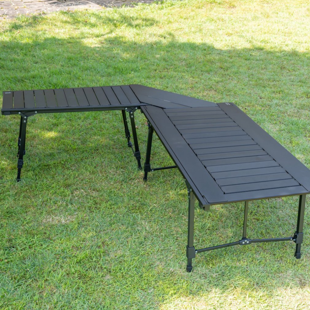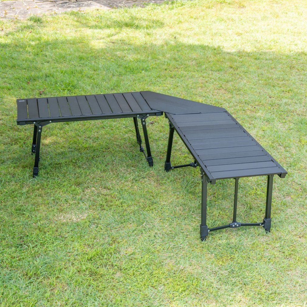 販売元のアルペンアウトドアーズから、アルミユニットテーブル88を2台連結させてL字型テーブルにするアイテム「アルミコーナー天板」が登場です。
