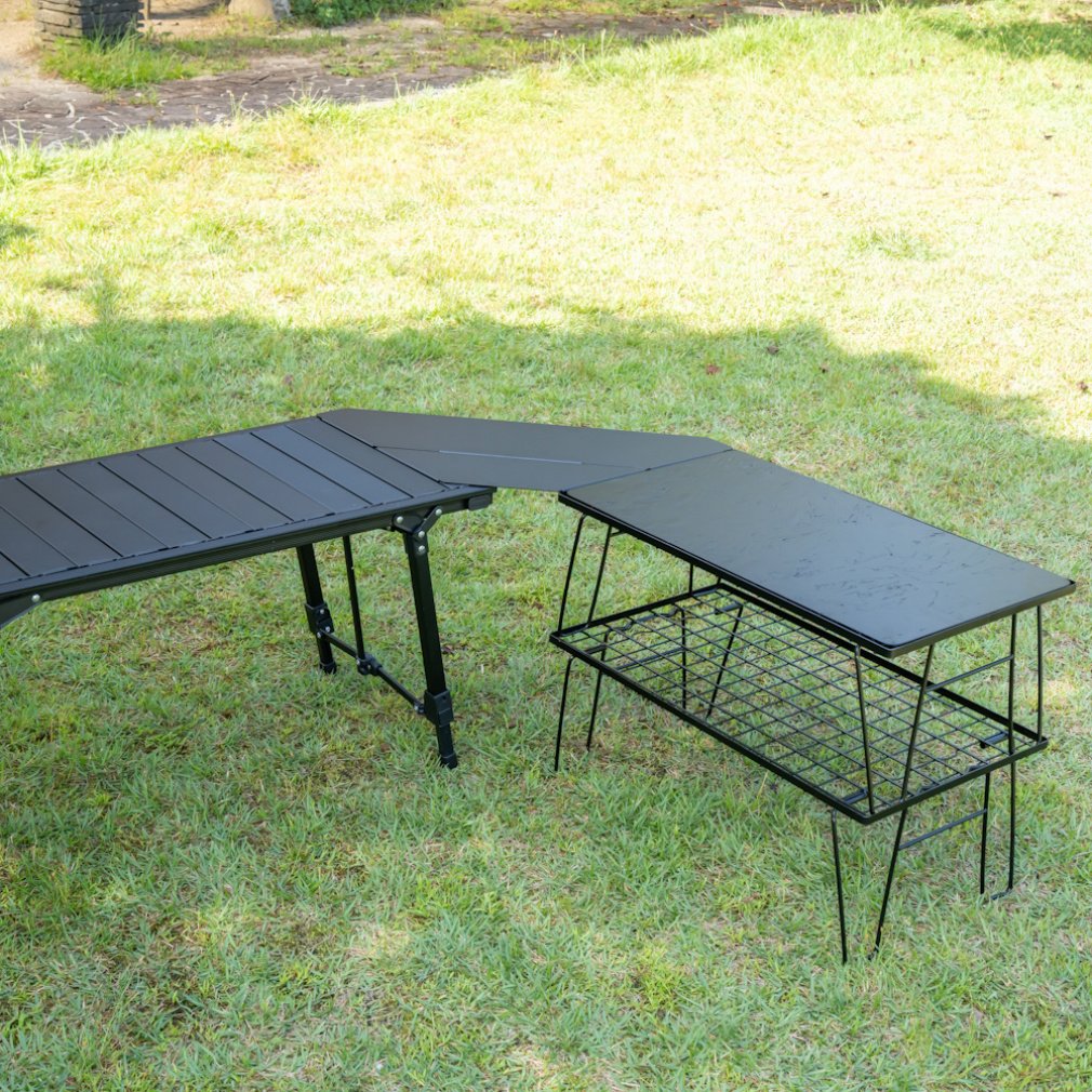 アルミユニットテーブル88を2台、あるいはアルミユニットテーブル88を1台と110を1台、またはアルミユニットテーブル88と軽量1.5kgアウトドアラックを2台所有されている方は、ぜひこのアルミコーナー天板を検討されてみてはいかがでしょうか。