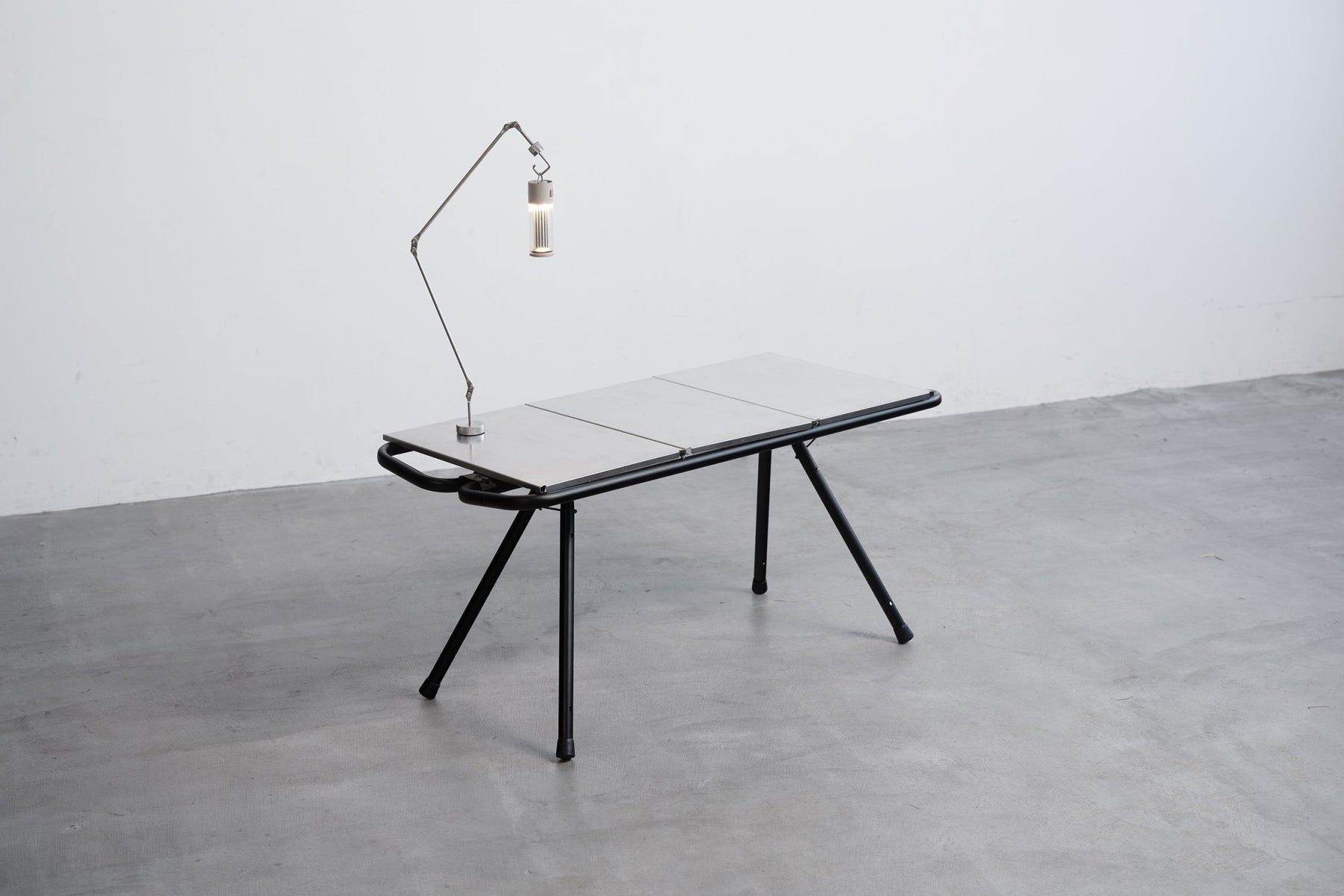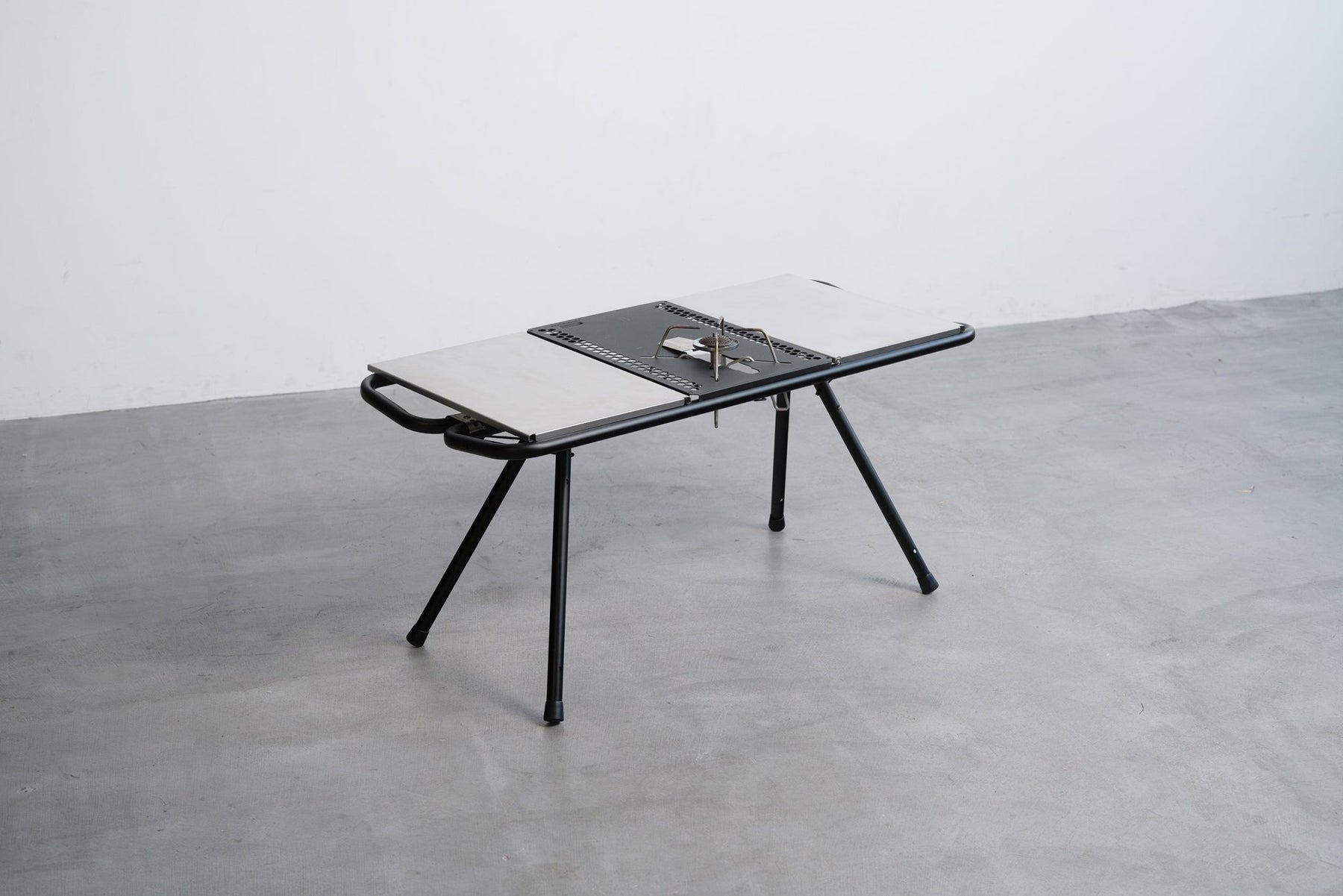 MFT マルチフレームテーブルを展開して1段階開いた状態だと、奥行きがスリムなサイドテーブル、2段階開いた状態にすれば、奥行きのあるメインテーブルとして使えます。