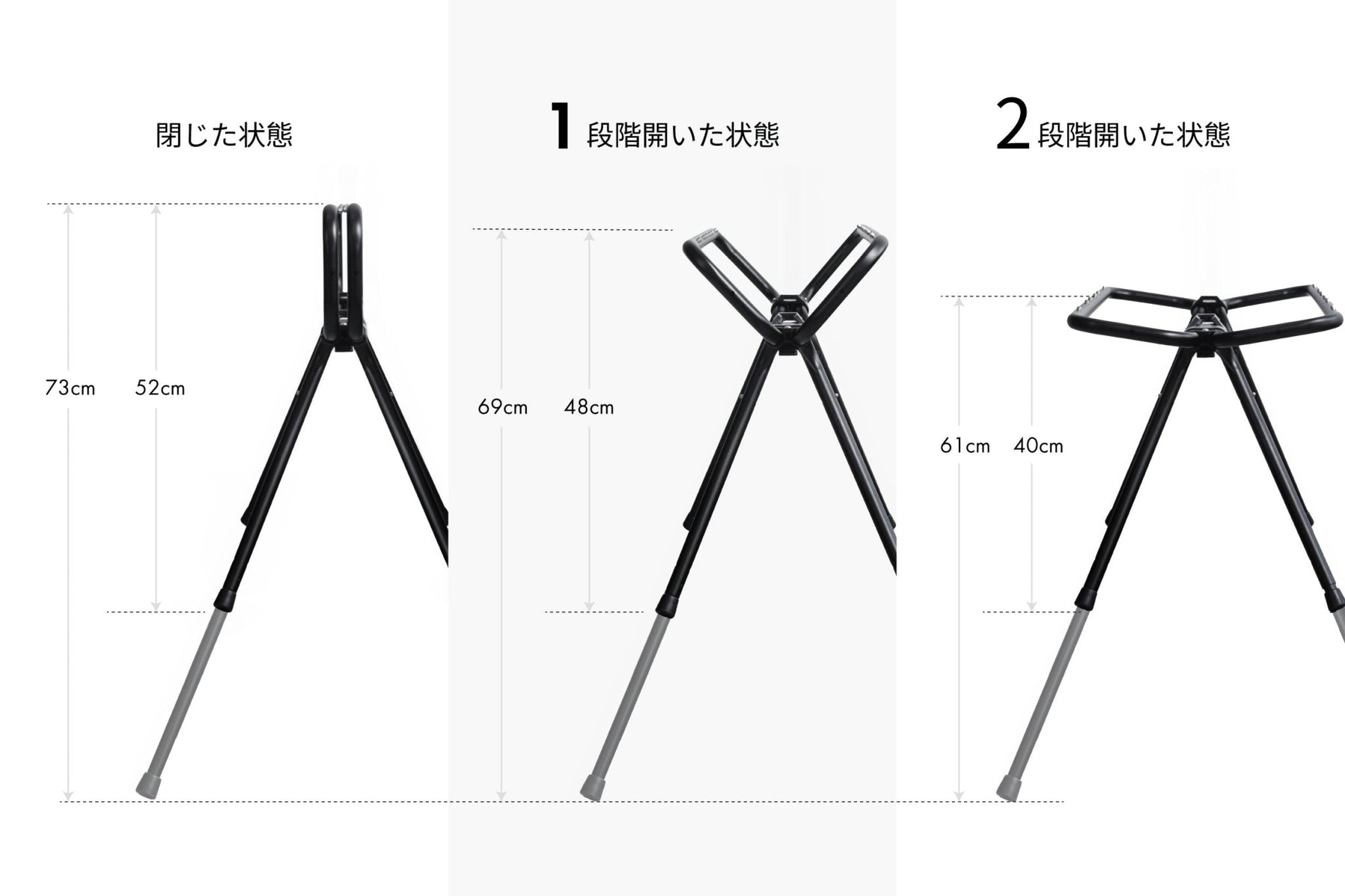 | サイズ | フレームを閉じた状態:W83 x D6 x H52cm/73cm フレームを1段階開いた状態:W83 x D26 x H48cm/69cm フレームを2段階開いた状態:W83 x D35.5 x H40cm/61cm |