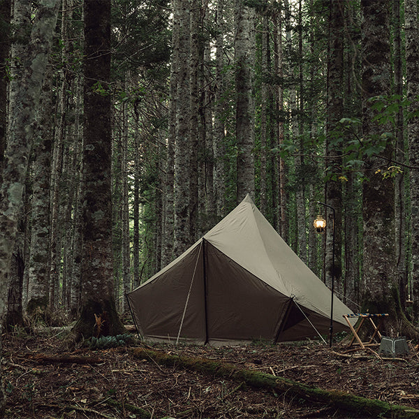 ベルテントのようでベルテントではなく、ワンポールテントようでワンポールテントでもない、どれにも属さない形が非常に印象的です。