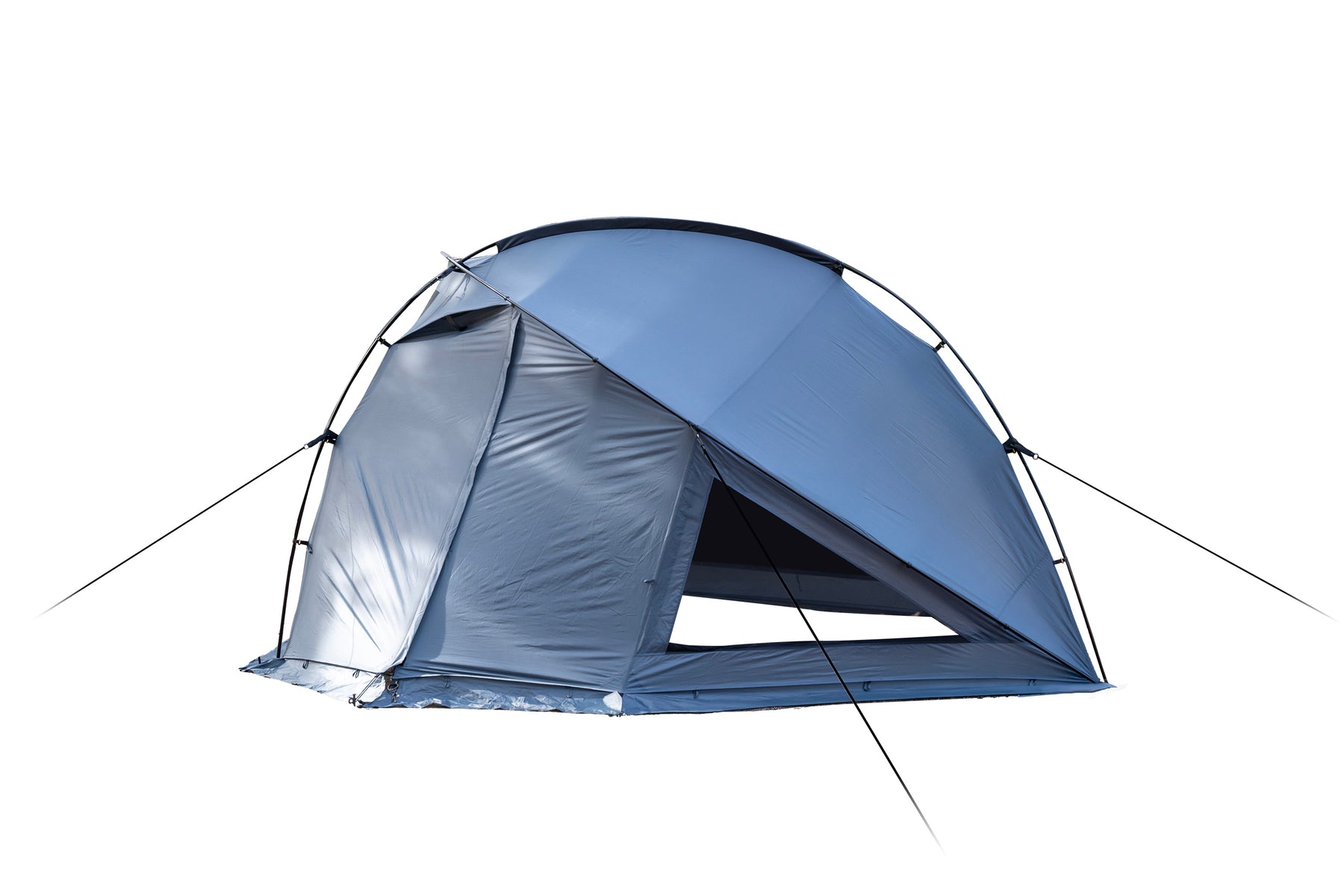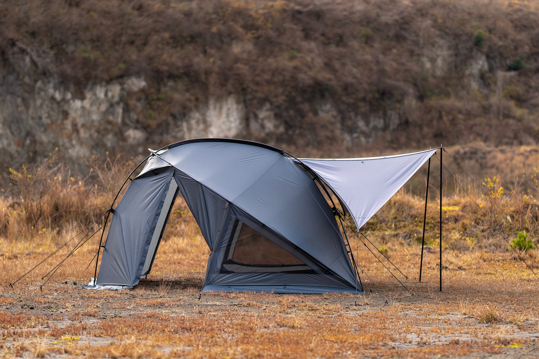 サイドフラップをシェルター本体に接続して、風や雨の吹き込みを軽減しながら、プライベート空間を確保したり、サイドフラップを広げて開放的な景色を楽しみながらキャンプをすることもできます。