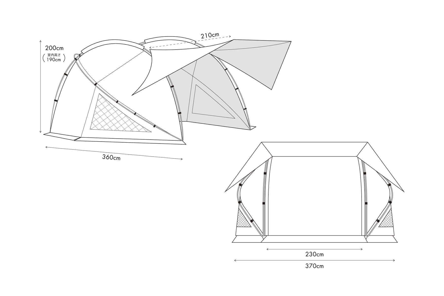 どことなくトンネルテントのようにも見えますが、サイドのサブポールによって、圧迫感がないような作りとなっています。