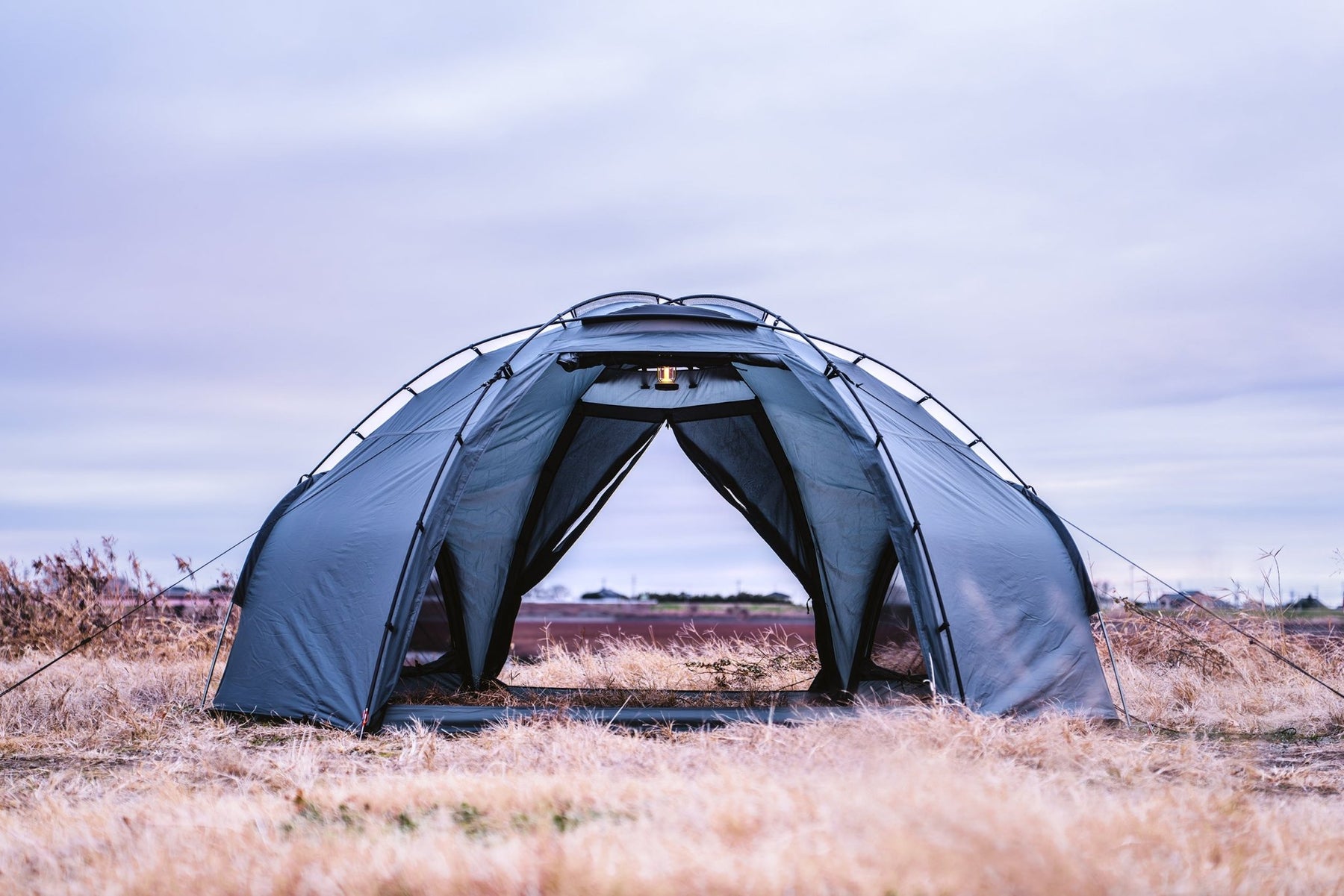 カラーは、グレーとブラックの2種類あり、オーソドックスなドームテントのように見えますが、変形六角形の形状をしており、快適さと軽快さの両立したテントに仕上がっています。