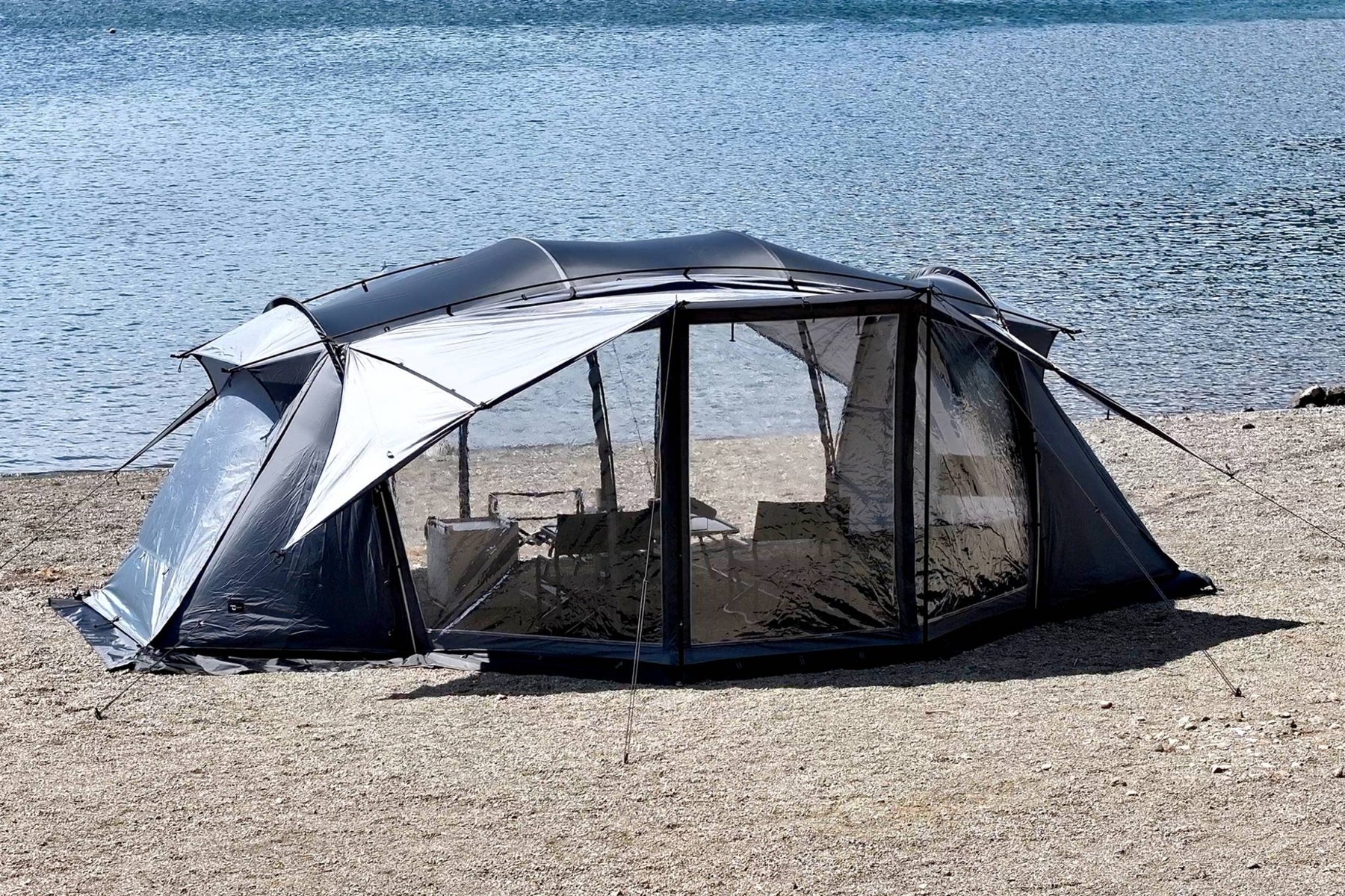 メインパネルを開放したまま、タープ状に張ったアウターパネル下までスペースが利用できるため、居住空間がさらに広がります。